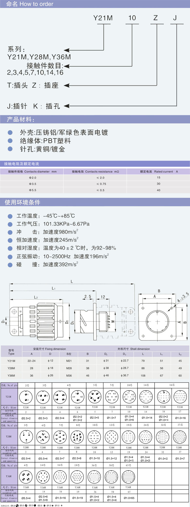 Y series connector include 21mm,28mm,36mm,dlfferent size has different poles.Y series circular connectors are widely used in llne connections between electrical equlpment,various instruments a nd meters.these connectors have the features of small volume, light weight,convenient application,high durability of plug and unplug,high conductivity and hlgh dielectric strength.