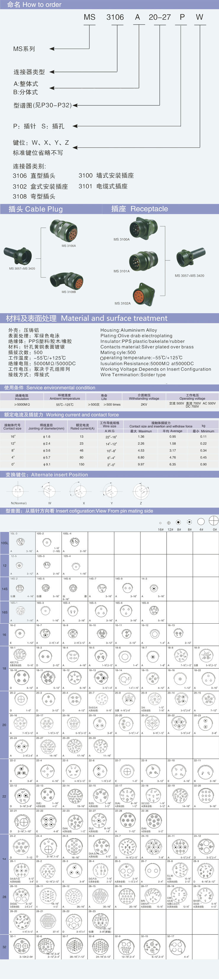 MS系列連接器是參照美國MIL-C-5015G標(biāo)準(zhǔn)研制生產(chǎn),可靠性好,互換性能強(qiáng),通用國外同類產(chǎn)品。該系列圓形連接器特別設(shè)計(jì)用于軍事用途,廣泛應(yīng)用于工業(yè)行業(yè),大量的規(guī)格使產(chǎn)品滿足不同客戶的需求。MS 系列連接器是各種不同應(yīng)用領(lǐng)域的最好的解決方案。